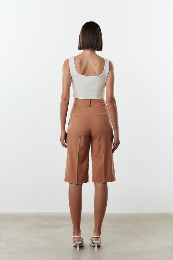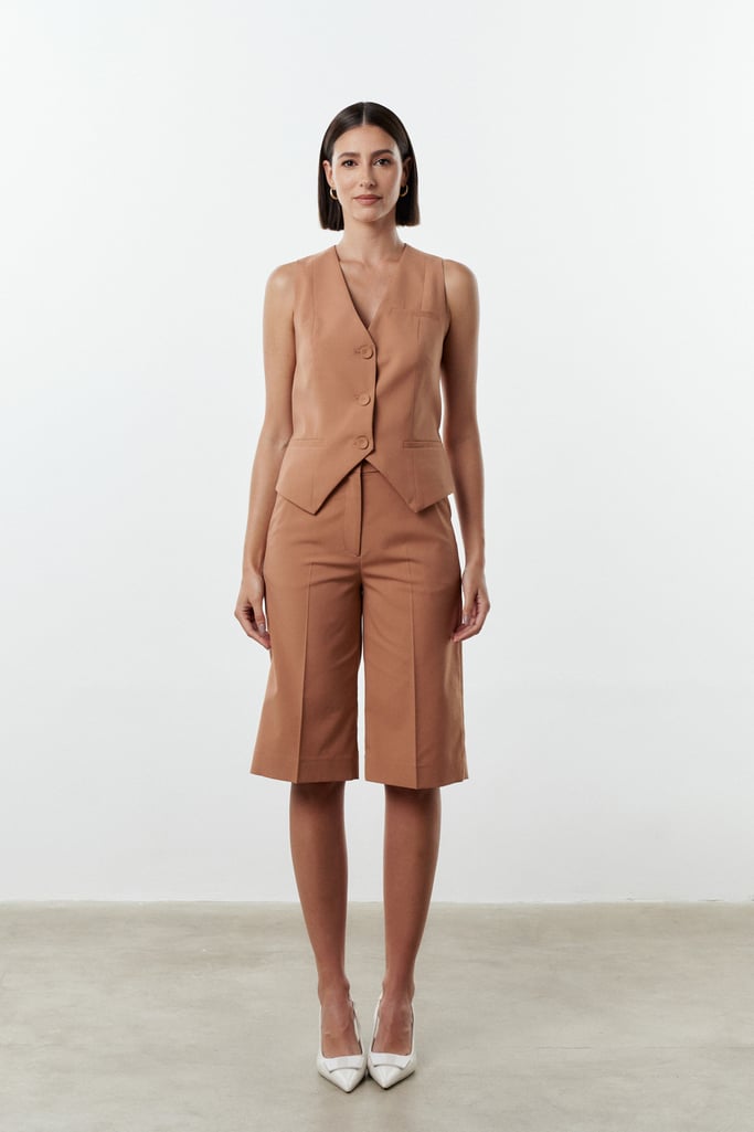 Modelagem de alfaiataria cintura alta, comprimento na altura do joelho e barra levemente aberto.