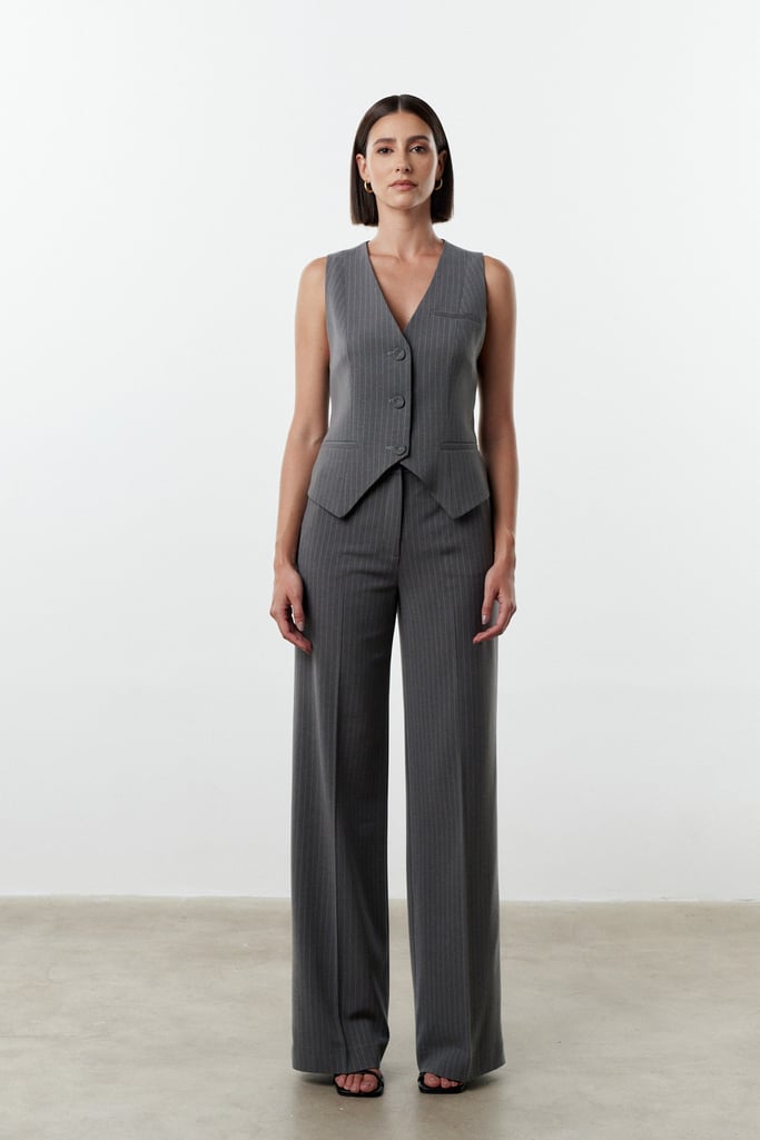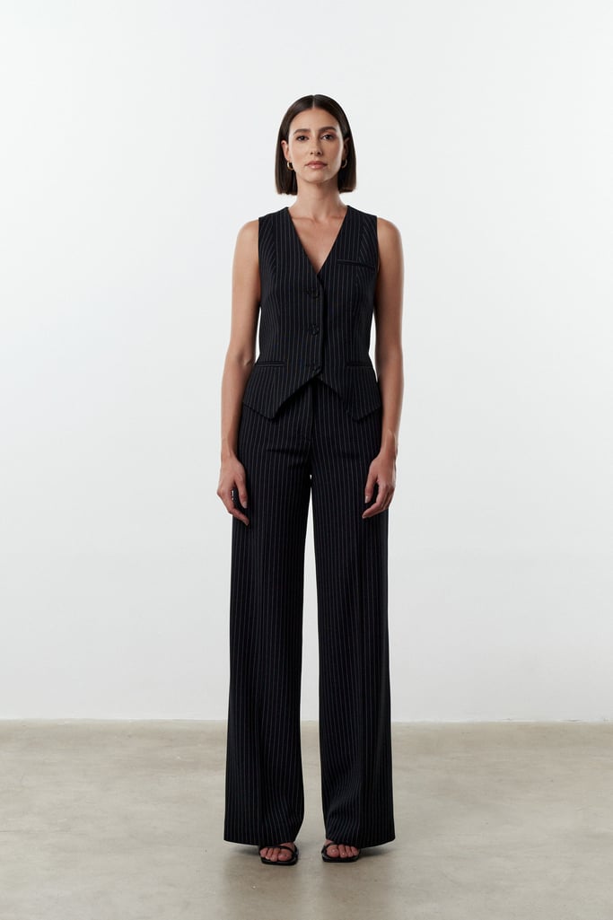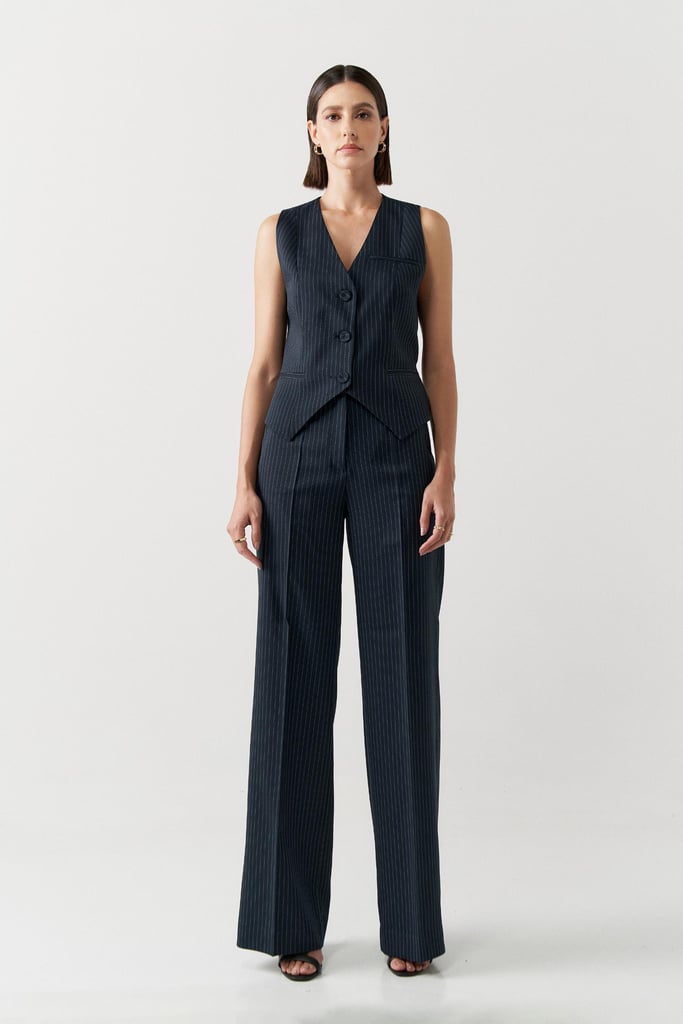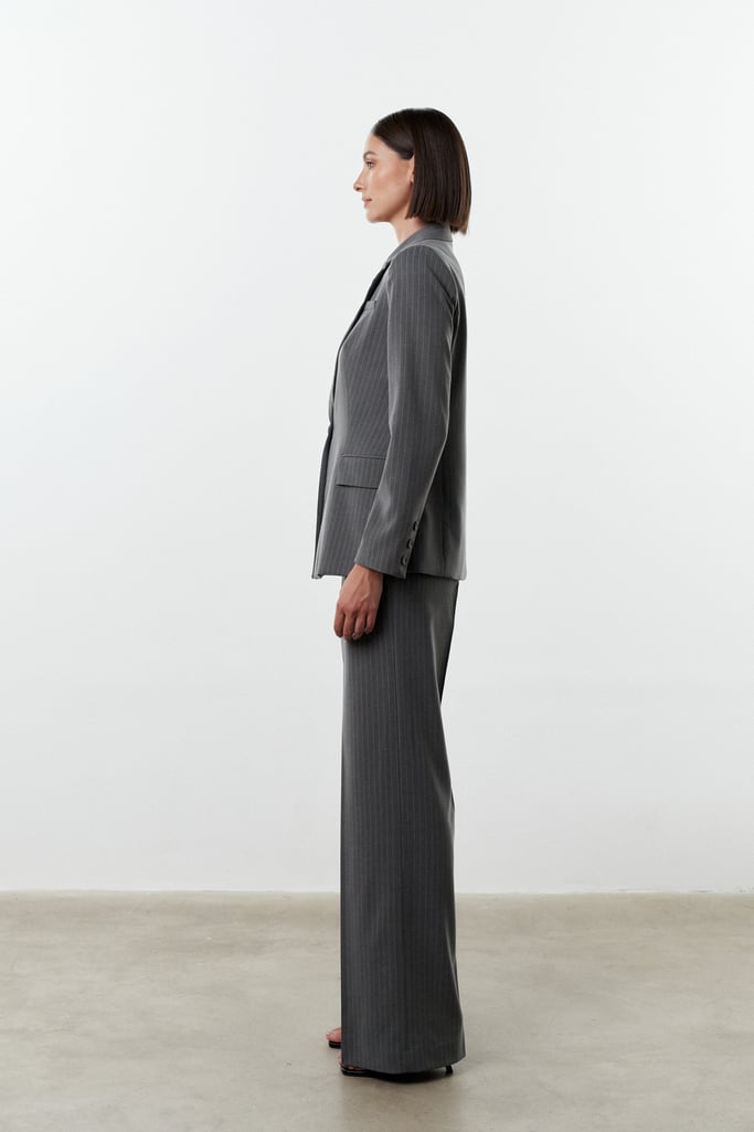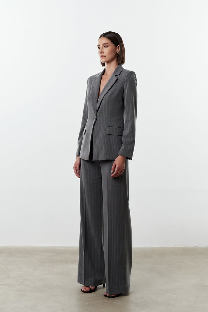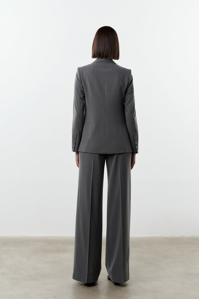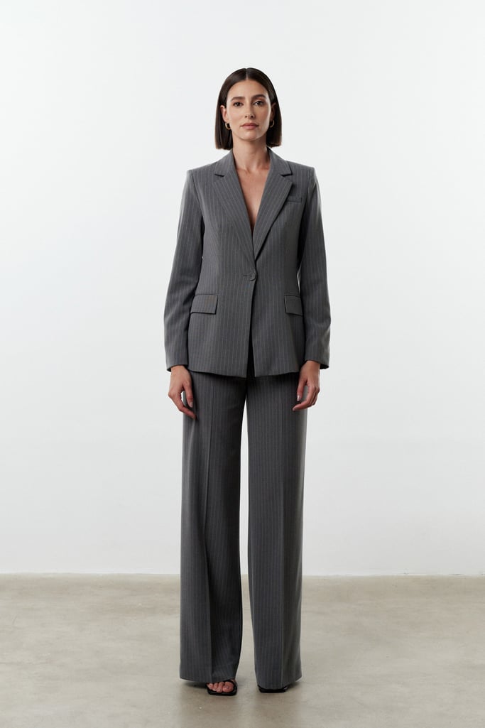 Modelagem clássica de alfaiataria, justa com silhueta acinturada.