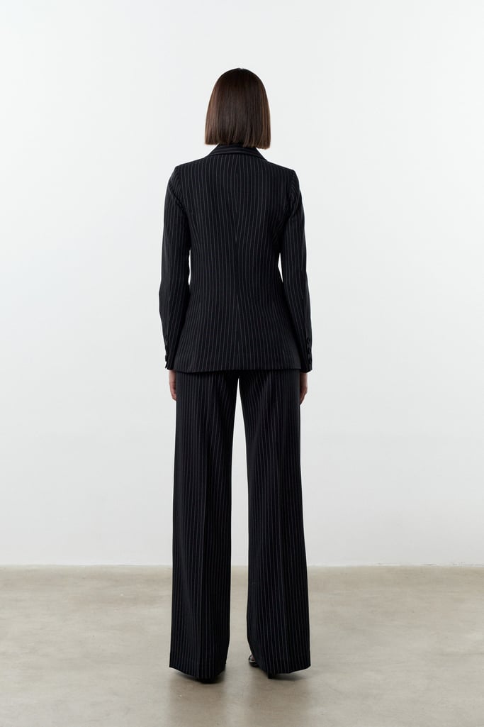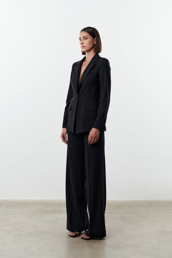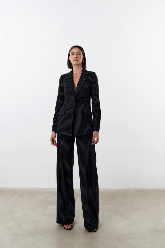 Modelagem clássica de alfaiataria, justa com silhueta acinturada.