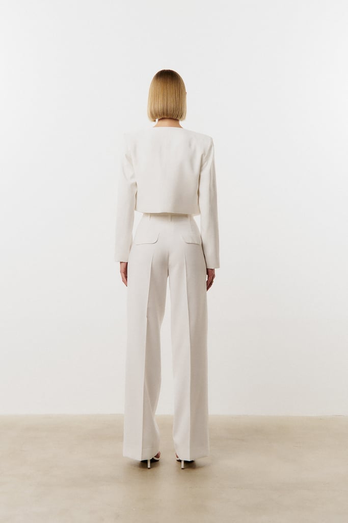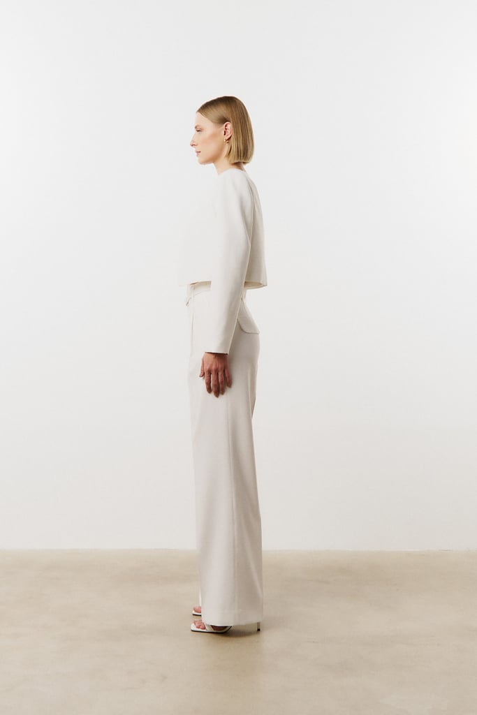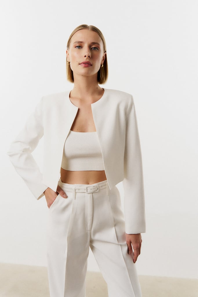 Blazer de caixa neutra, comprimento na altura da cintura e sem fechamento frontal.