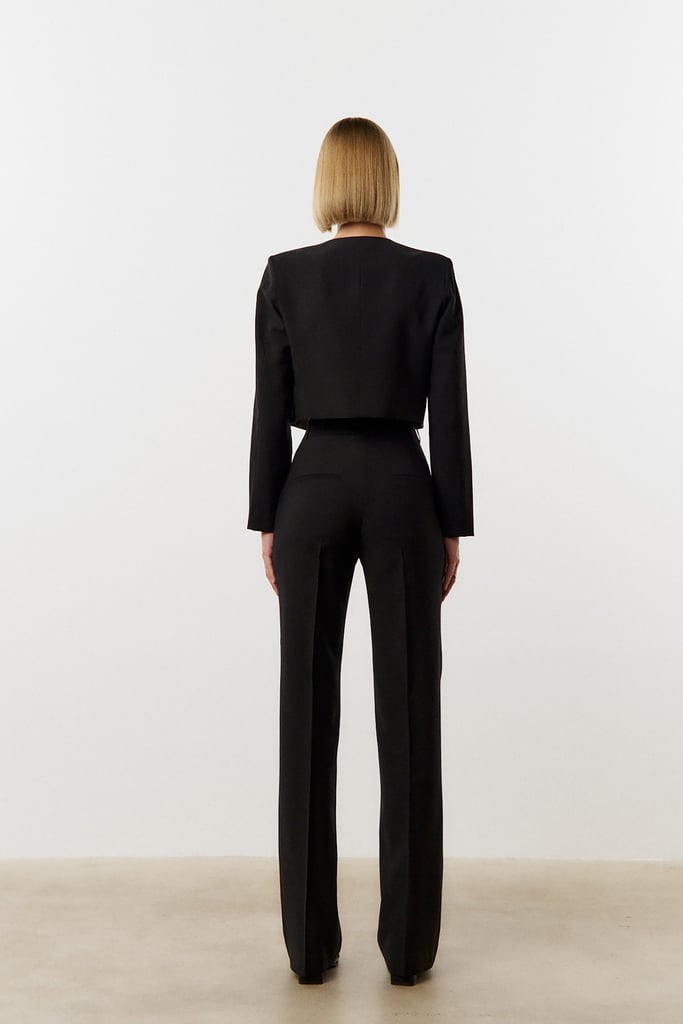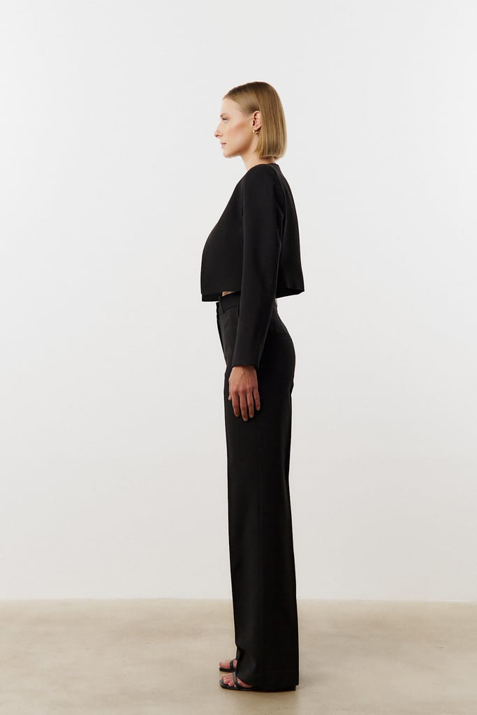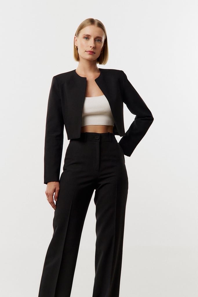 Blazer de caixa neutra, comprimento na altura da cintura e sem fechamento frontal.
