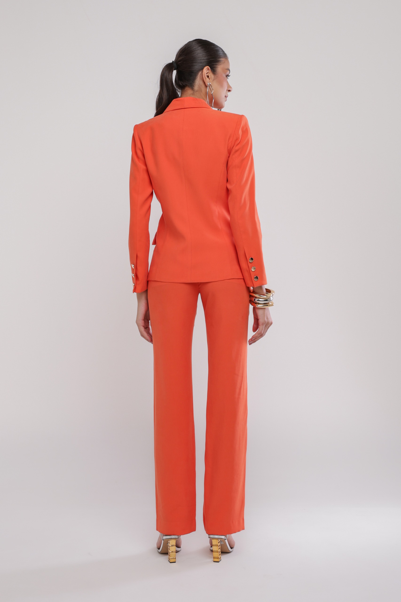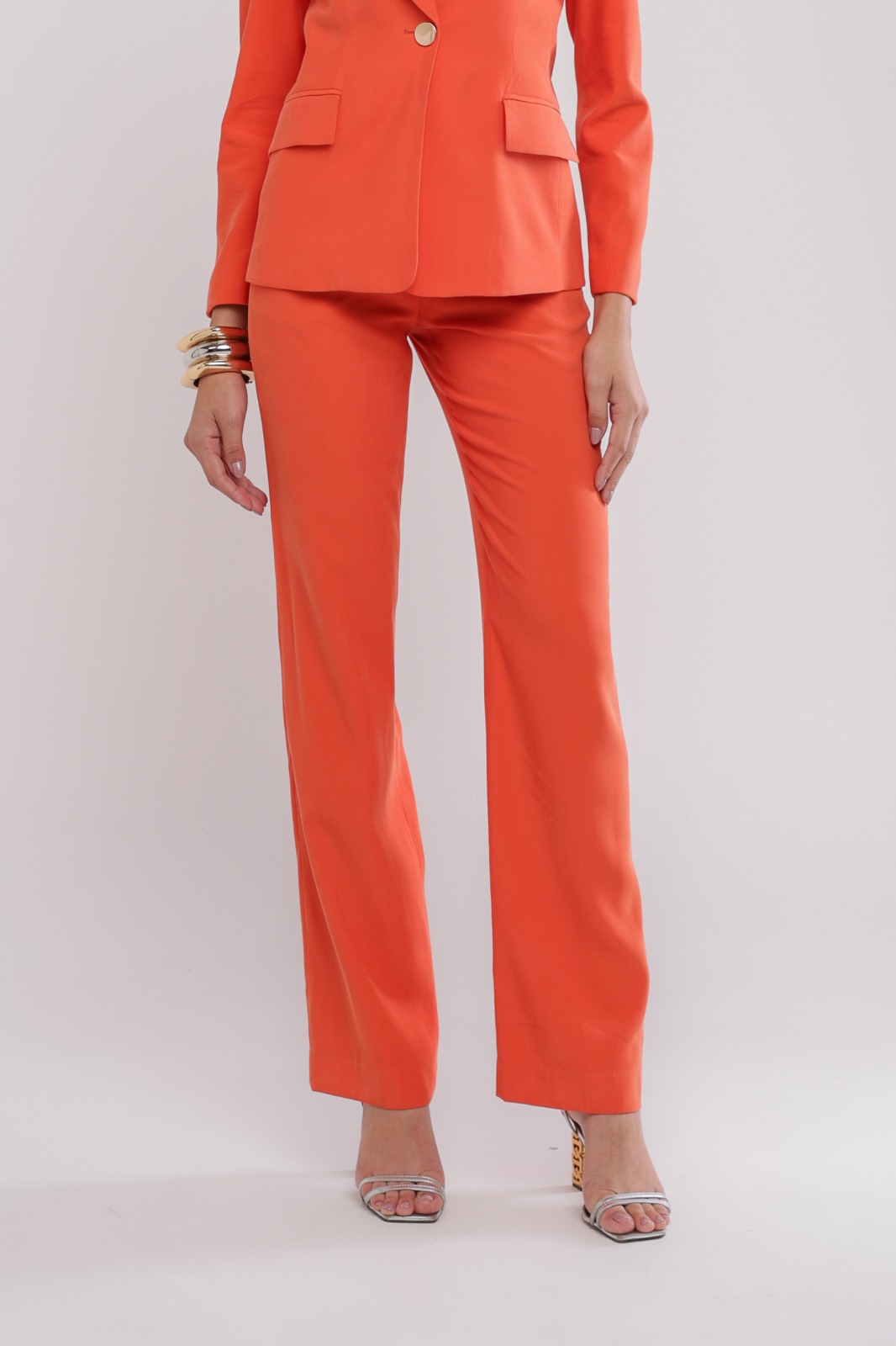 Modelagem de cintura média, silhueta reta e um caimento neutro.