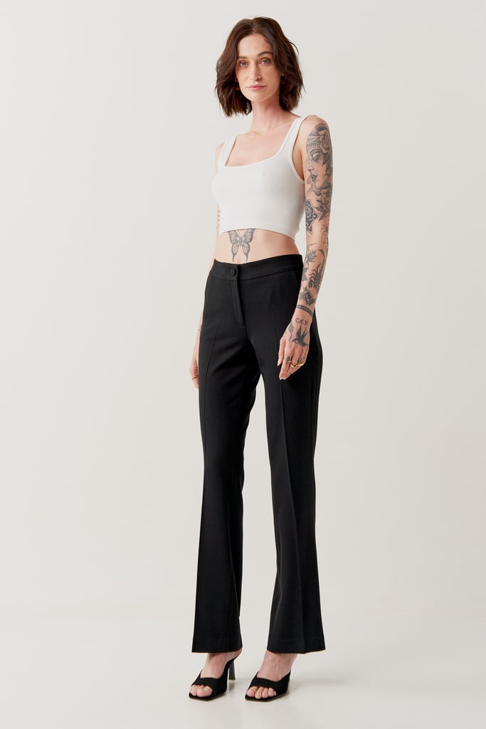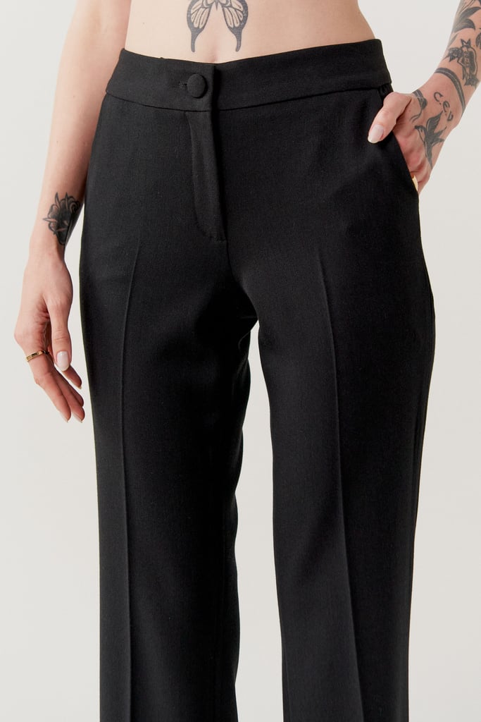 Modelagem em alfaiataria, altura média do cós, silhueta mais justo ao corpo, alongado e reto e detalhe de vinco nas pernas.