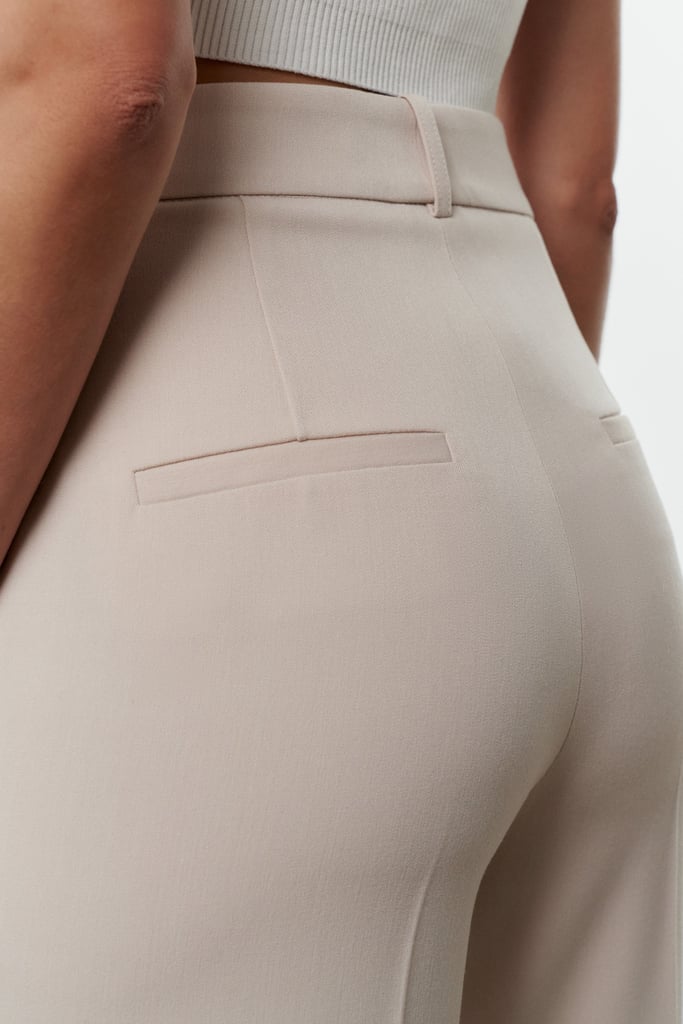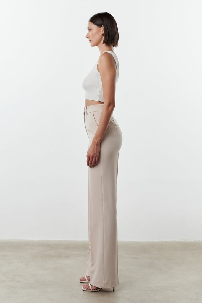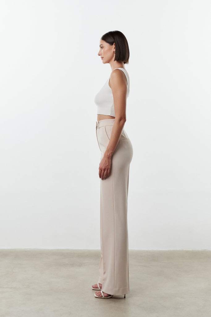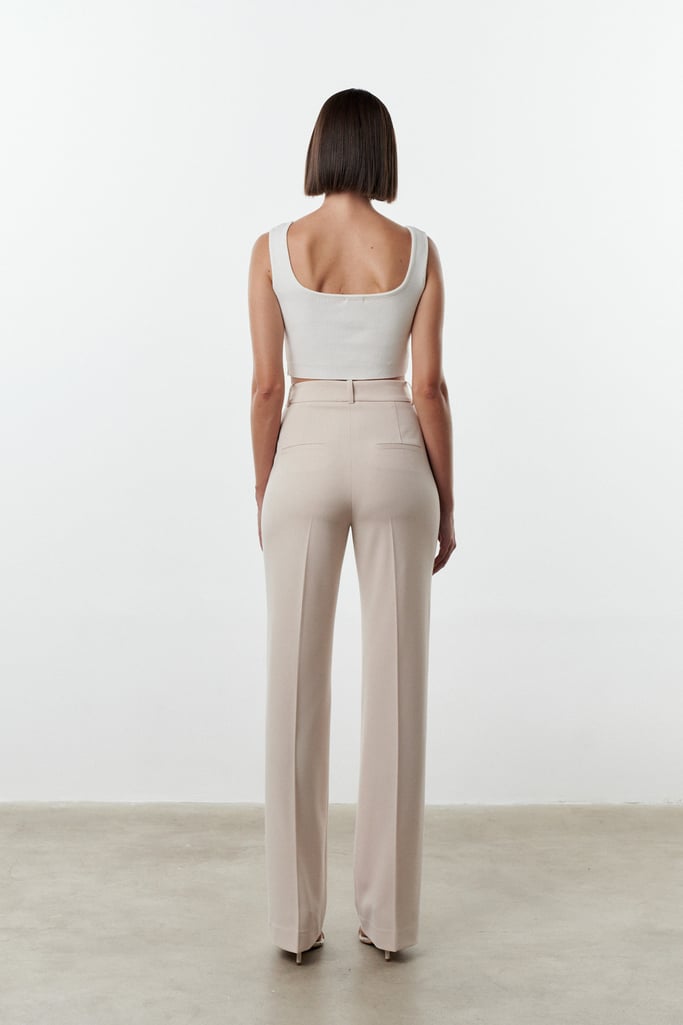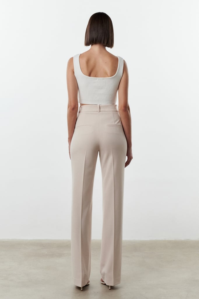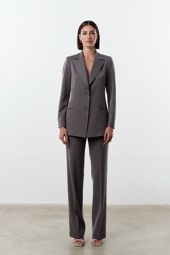 Modelagem clássica de alfaiataria, cintura média com silhueta reta e um caimento que não fica justo.