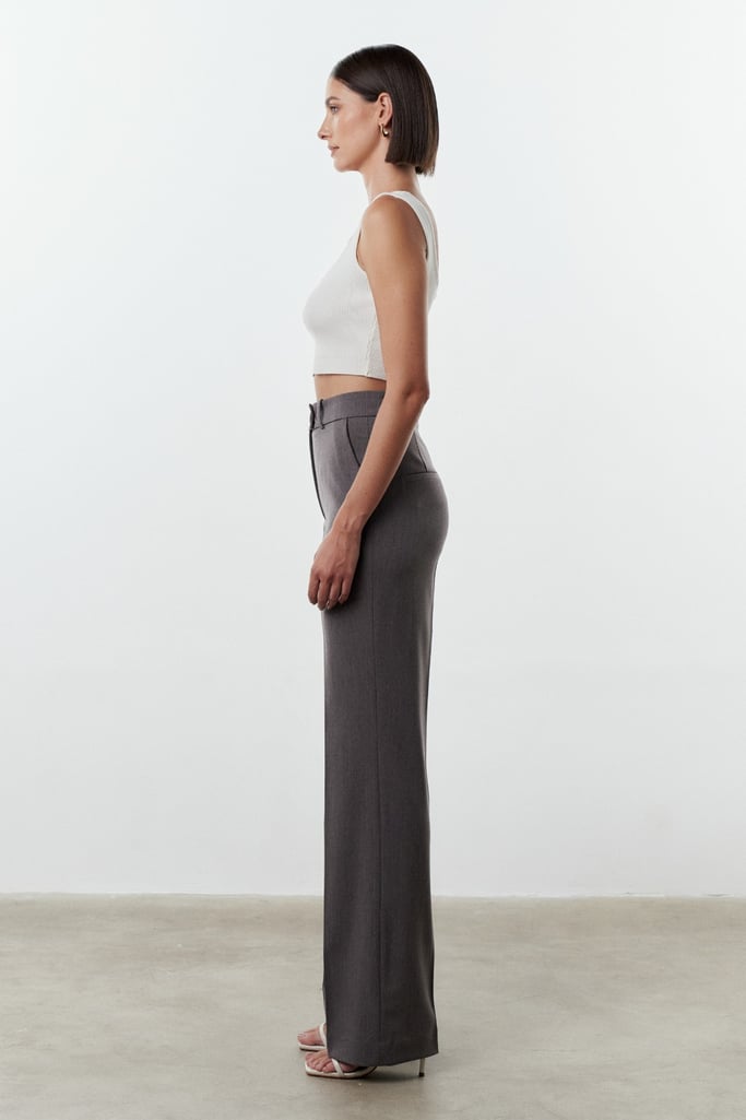 Modelagem clássica de alfaiataria, cintura média com silhueta reta e um caimento que não fica justo.