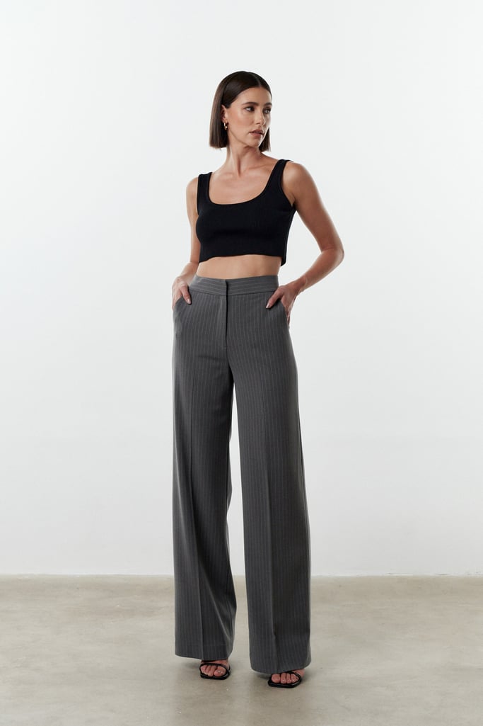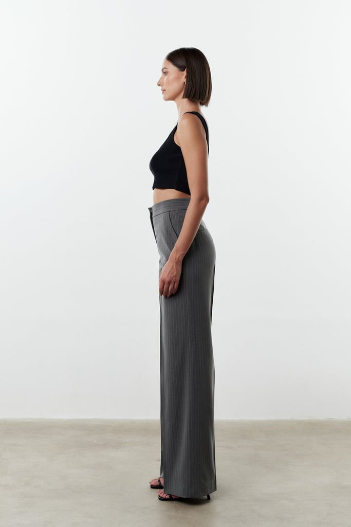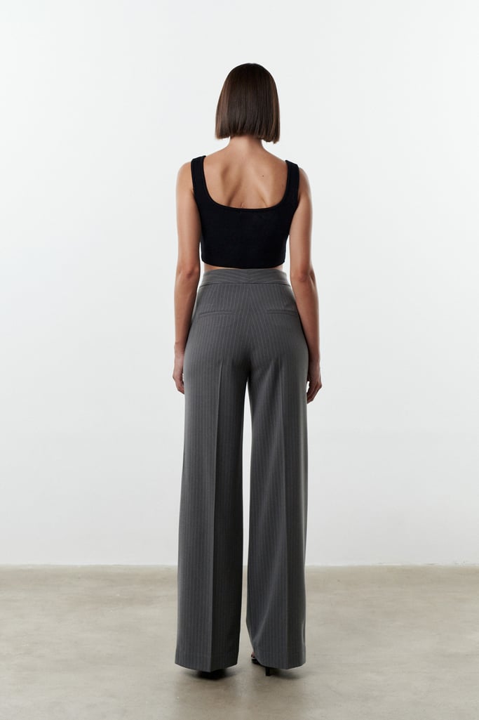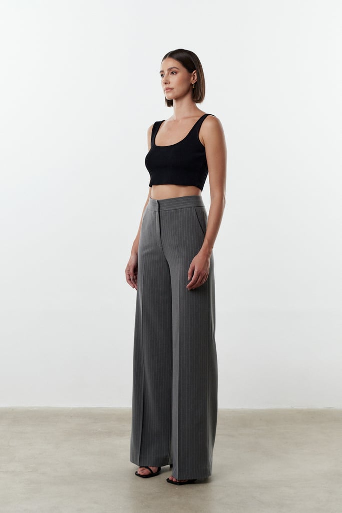 Modelagem wideleg de cintura alta com a parte superior levemente justa e pernas mais amplas.