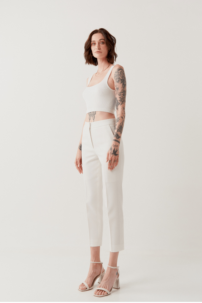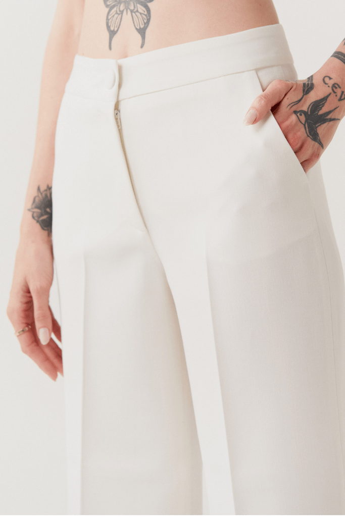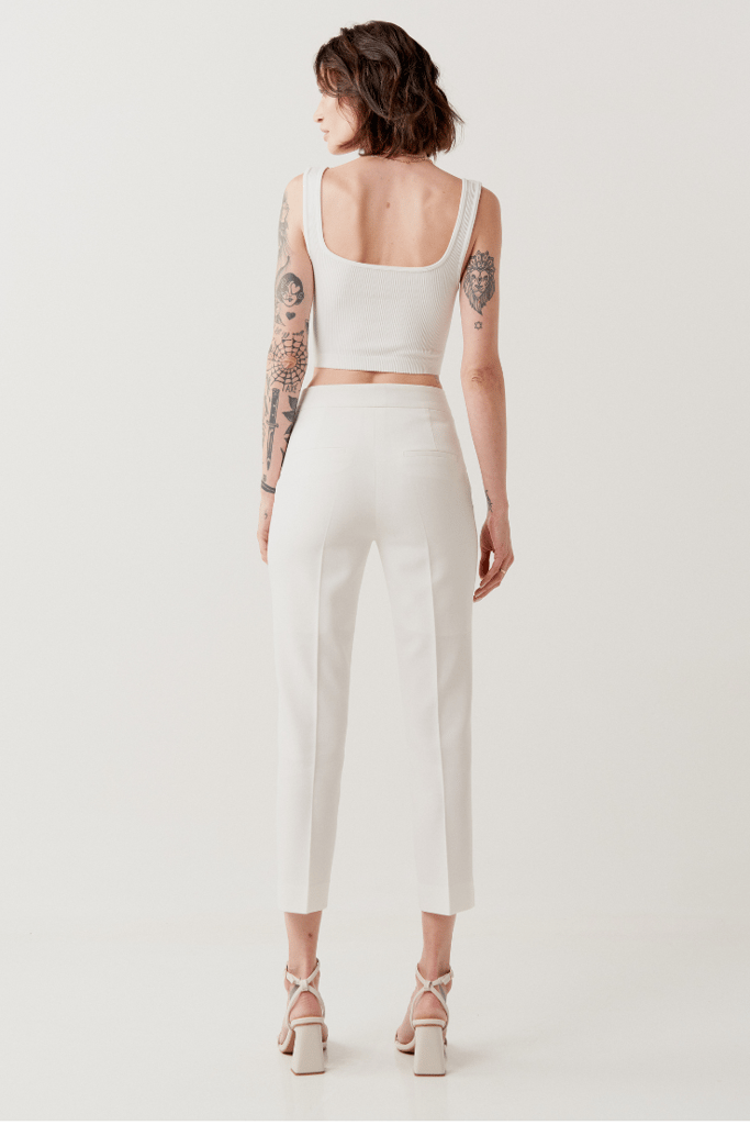 Modelagem em alfaiataria com caimento mais ajustado ao corpo, levemente mais curto e detalhe de vinco nas pernas.