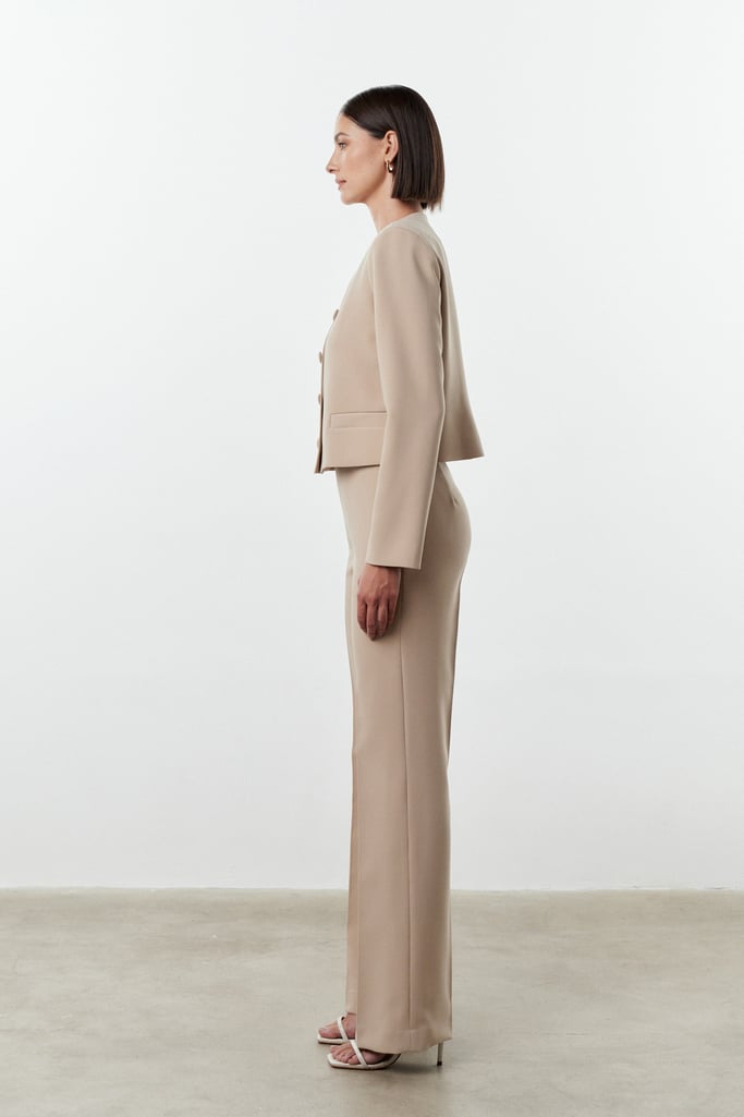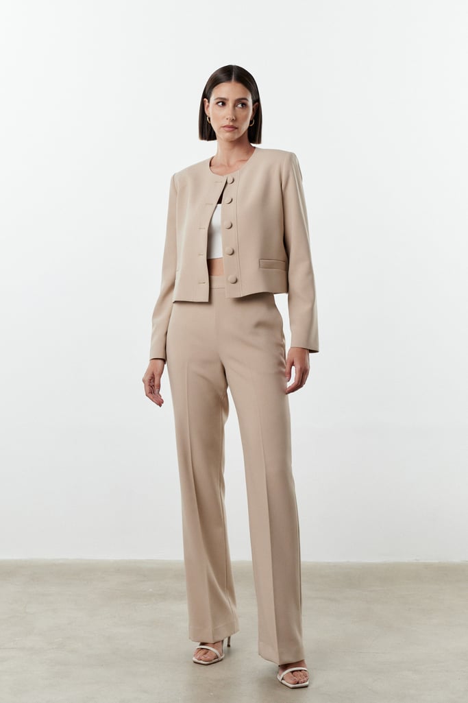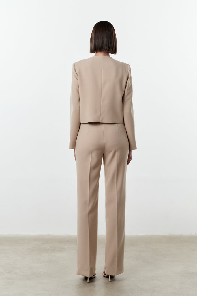 Confeccionado em tecido de alfaiataria de levemente encorpado e toque macio.