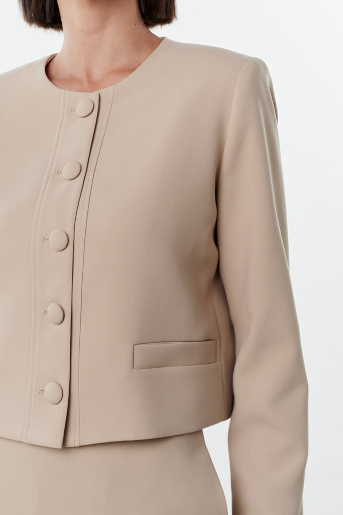 Bolso frontal avivado e fechamento frontal por botões forrados do mesmo tecido.