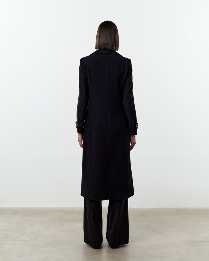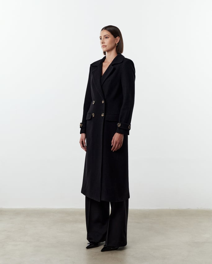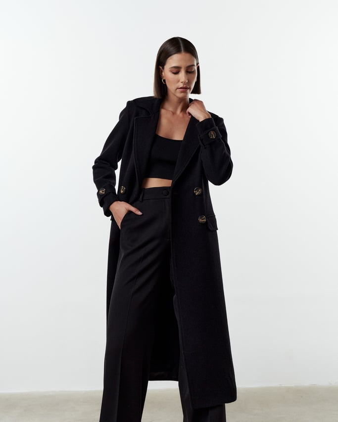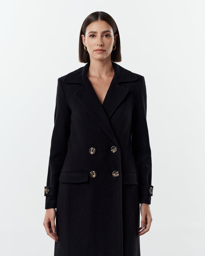 Modelagem clássica ligeiramente acinturada com fechamento transpassado por botões.